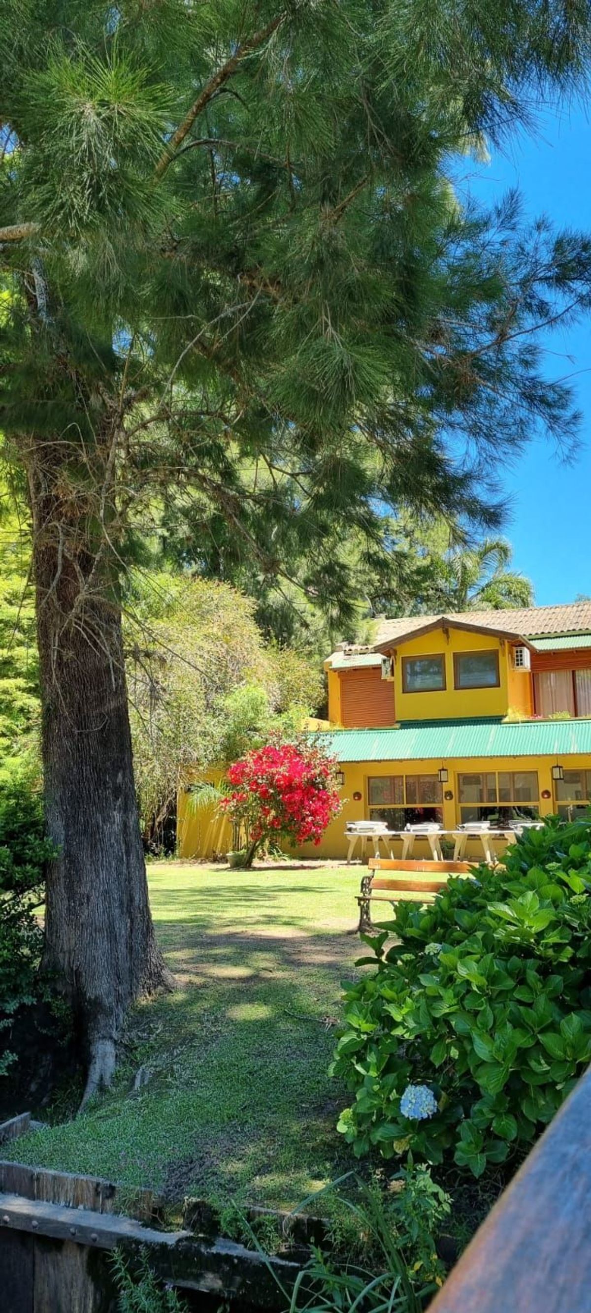 La casona, ubicada frente al río, tiene 600m2, amplios espacios y todas las habitaciones con baño privado. En la planta baja hay sillones, una galería cerrada con vista al río, un salón intermedio con sillones, hogar a leña y comedor para las cenas y una galería con vista a los jardines donde hay mesas para desayunar/almorzar y ping pong.